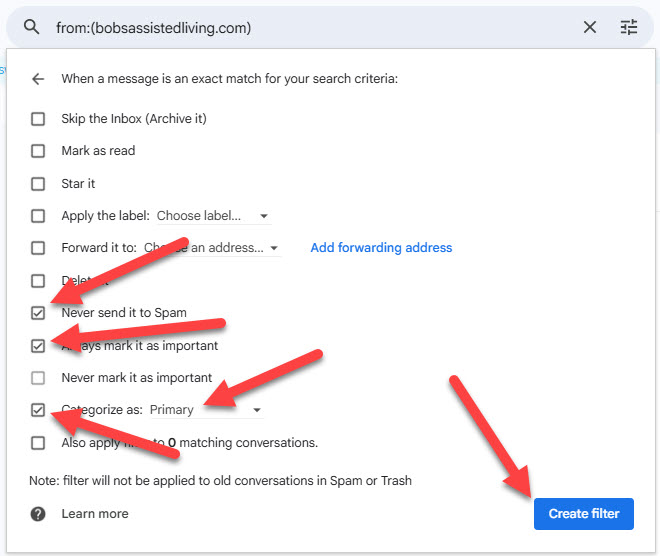 5. Put a checkbox next to “Never send it to Spam”, “Always Mark it as important”, and “Categorize as:” and select “Primary” and then click the blue “Create Filter” button in the lower right.
