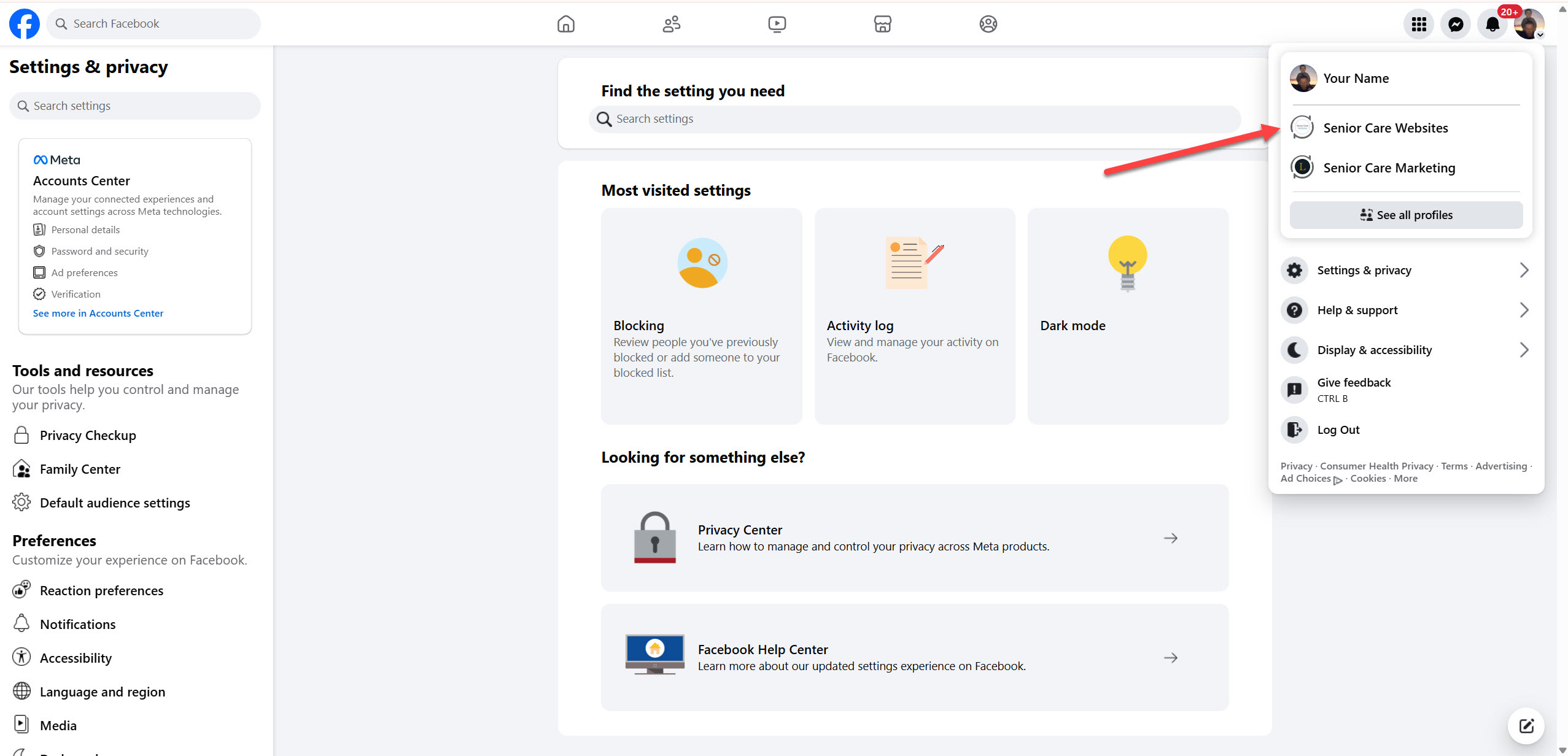 1. Log into Facebook on your desktop or laptop computer and go to https://www.facebook.com/settings/?tab=pages and then make sure you are selected on your business profile page by selecting it in the upper right corner as shown in the image below.