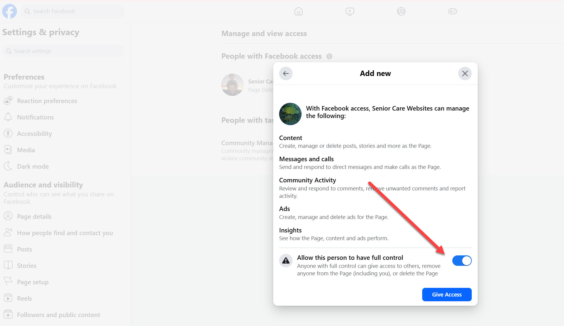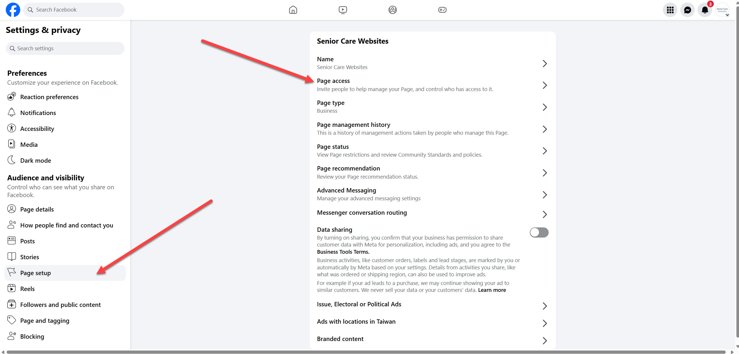 2. Once you are on the correct Facebook Page account, make sure you choose “Page Setup” on the left side of the screen, and then click “Page Access” in the middle column.