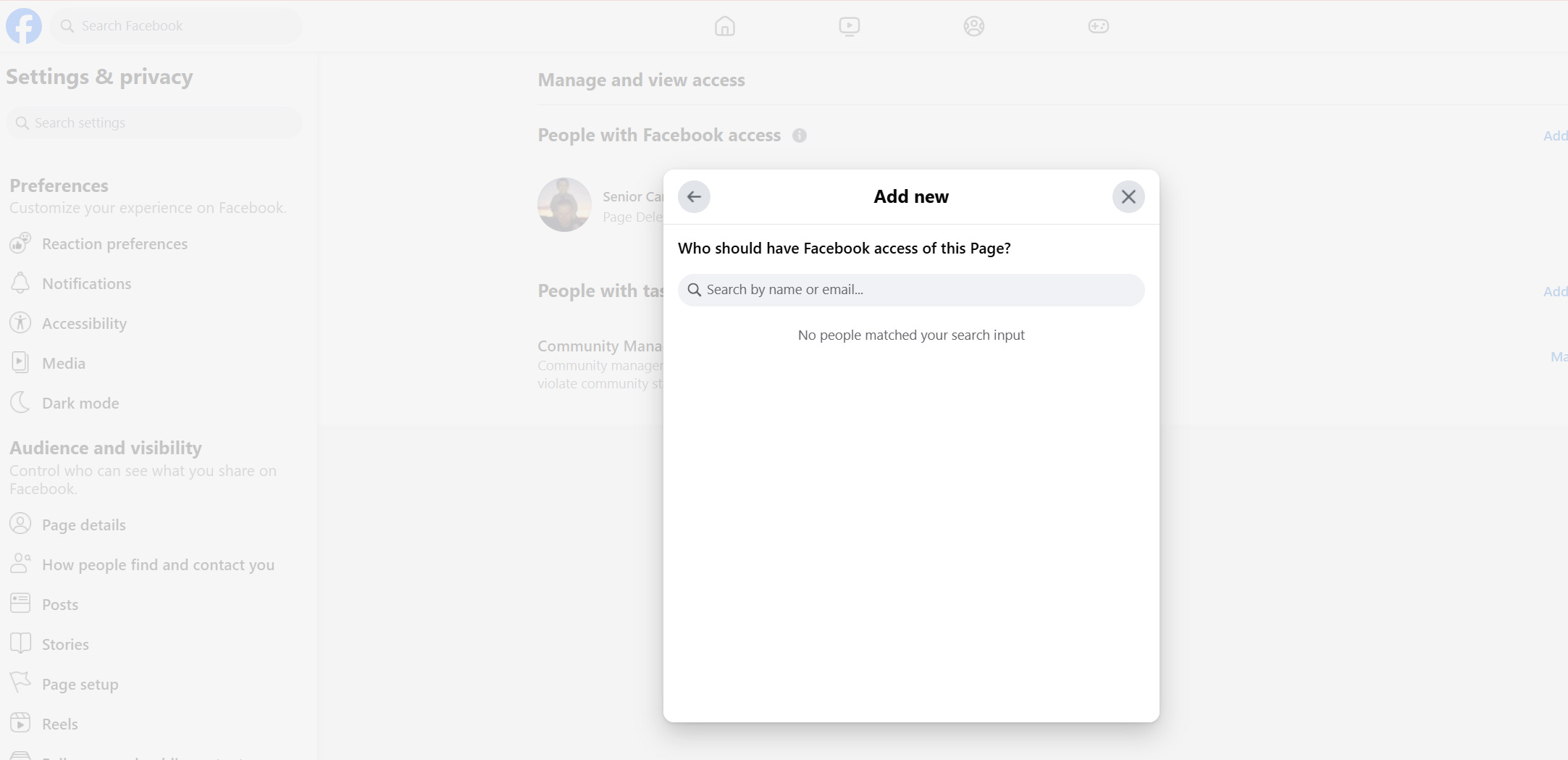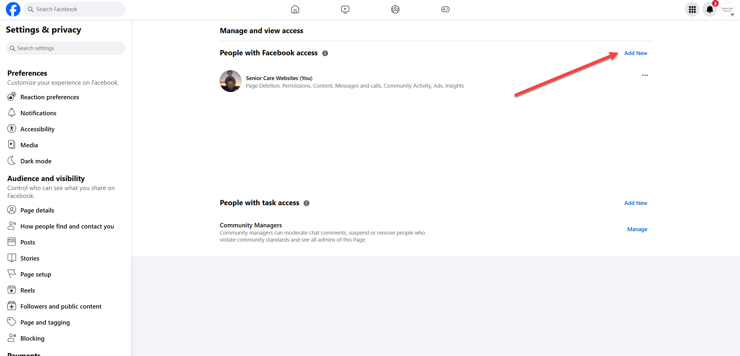 3. You should then see a screen that says “People with Facebook Access”. Click the “Add New” button in the upper right corner.